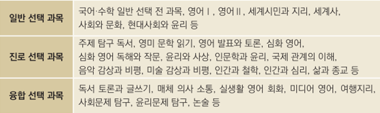 실용 영어, 영어권 문화, 진로 영어, 영미 문학 읽기, 음악ㆍ미술감상 비평