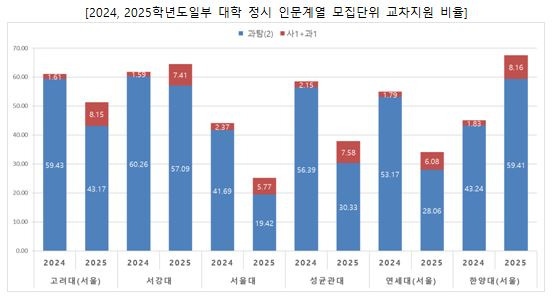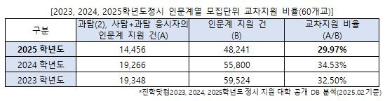 수도권 대학과 지방거점국립대를 포함한 60개 대학 정시모집에 실제로 지원한 대학을 진학닷컴에 공개한 수험생을 분석한 결과, 인문계열 모집단위에 지원한 학생 중 과탐 2과목 또는 과탐+사탐 응시자의 비율은 2024학년도 34.53%에서 2025학년도에 29.97%로 줄었다.